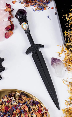 This athame resembles a dagger with a detailed hilt and crescent design. Made from sturdy zinc alloy. The handle of the blade has an amethyst crystal and it is decorated with a glittering glass gem in front. It can be used as an ornamental display item, or for ritual or magic use.