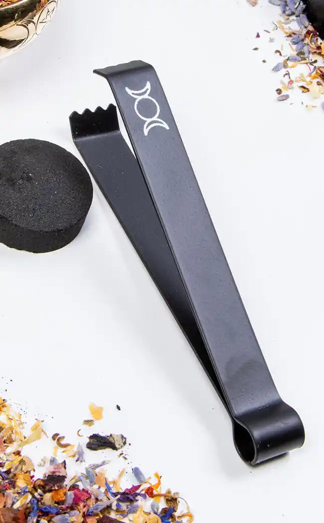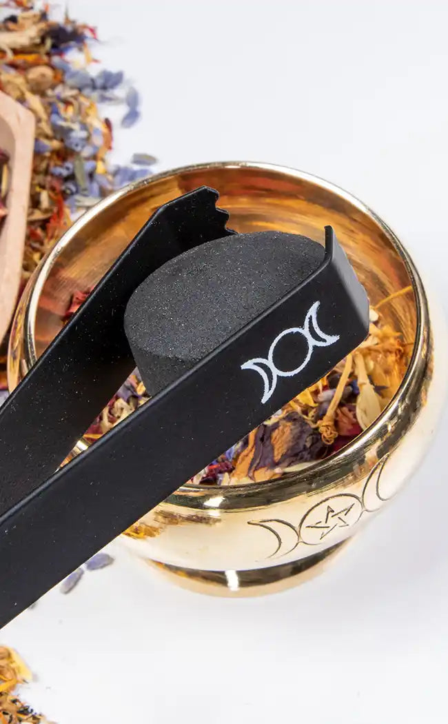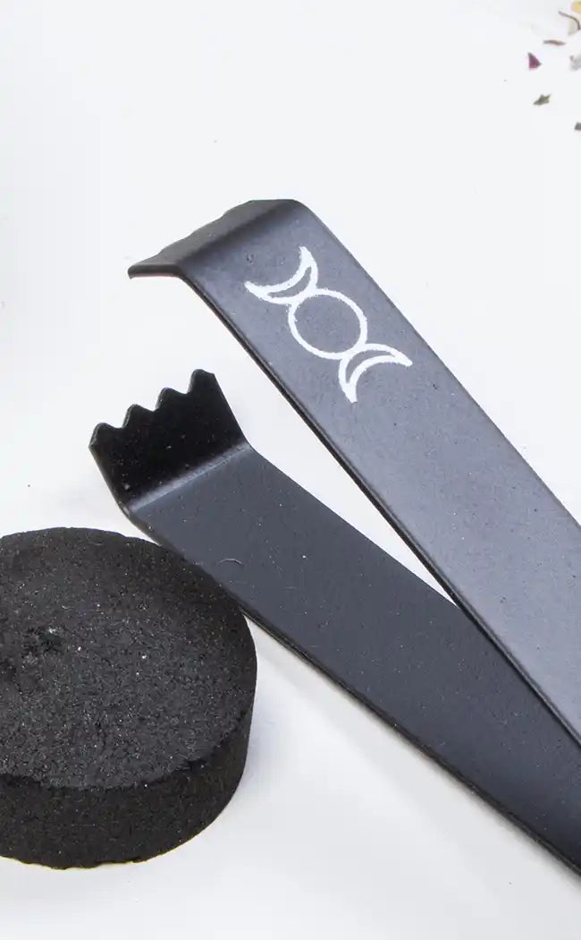 Beautifully embellished with the triple moon symbol, these iron tongs are intended to make using charcoal incense a little easier. You can use these tongs to pick up your lit charcoal for placement, rearrangement, or to hold while you ignite it before setting it in your charcoal burner.