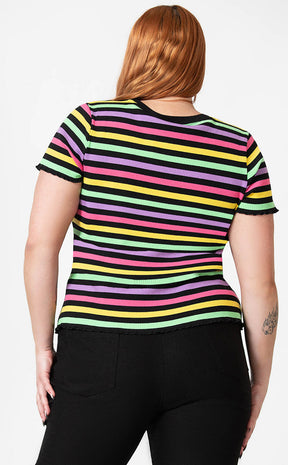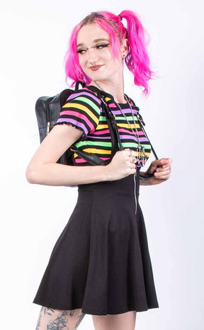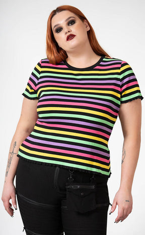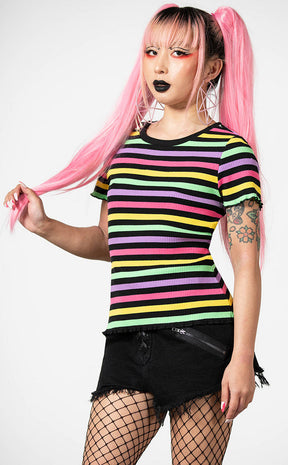 Show yer true colours in the Blair Rainbow Top! Soft, stretch cotton fabric is ribbed for your pleasure, coloured in every shade of the goth rainbow and shaped into a cute round neck tee with a lettuce hem. A versatile stylin' piece for every occasion!