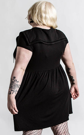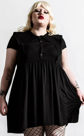 Get summergoth ready in this adorable skater! Soft and stretchy as all the best threads should be, this dress features a button-up front, an oversized collar with wicked embroidery and short cap sleeves.