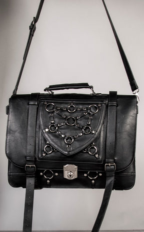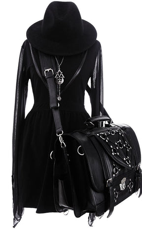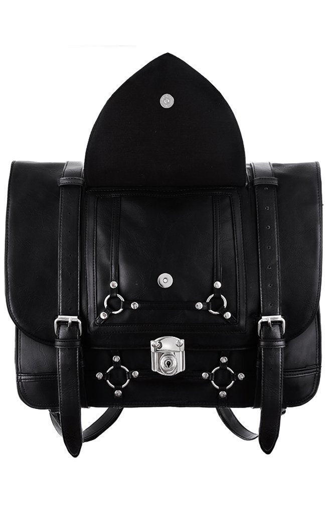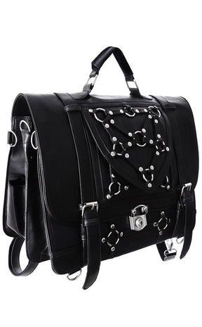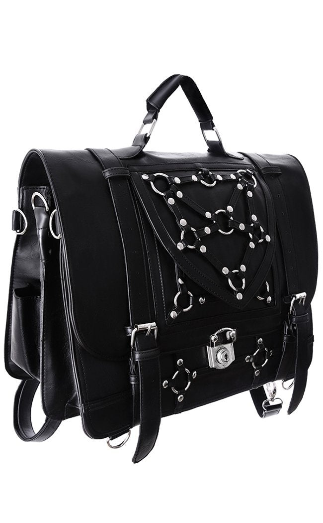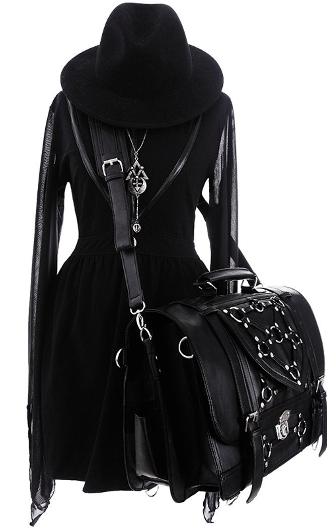 Gothic satchel bag in sturdy black faux leather featuring straps, rivets, and O-rings. Adjustable as a handbag or a Backpack.