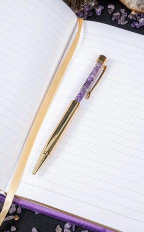 This purple journal features mystical, metallic gold detailing on the cover and a gold ribbon page marker, paired with a sleek amethyst crystal pen for promoting clarity and clearing negative thoughts