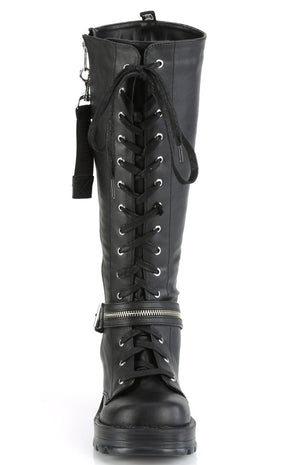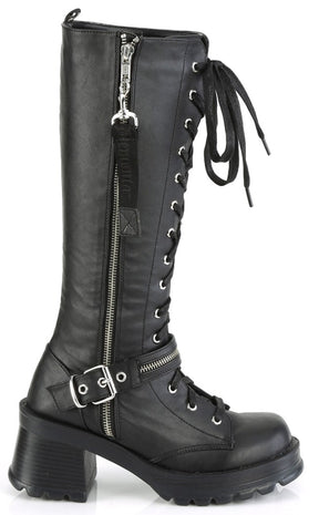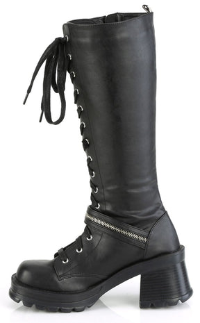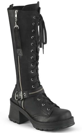 Get yerself in a bratty mood! The BRATTY-206 boots are a badass pair of knee-high combat boots, featuring lace-ups, a buckle strap with a zip and handy full-length side zip.