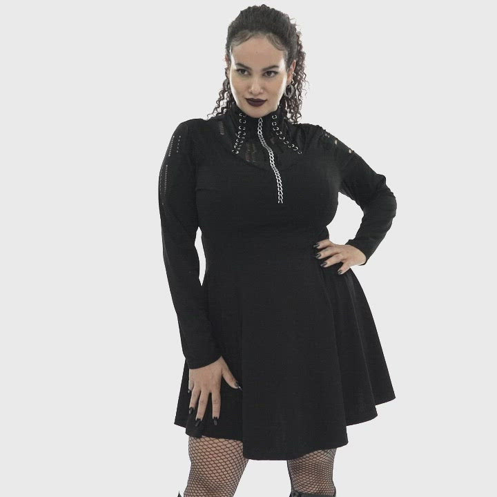 Shuck off the chains of boring fashion in the Break Free Dress! Soft, stretch fabric forms long sleeves, a skater length skirt and a fittest waist that can be cinched further with ribbons at the back. The high neckline features statement embroidery, lacing and shreds that continue down the sleeves to have you looking like something straight outta the Matrix.