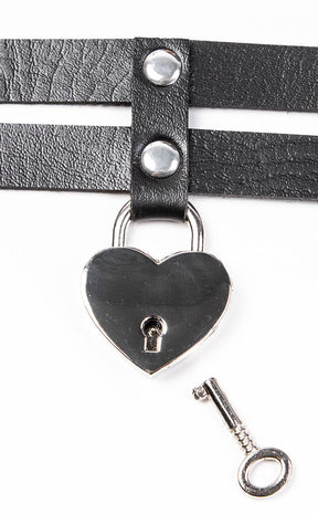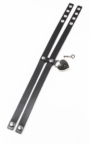 Cage your heart in layers of luxury vegan leather! Two straps are connected with a studded panel for a sultry garter effect, from which a heart-shaped padlock hangs.