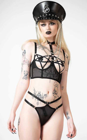 Hex it up and sex it up in the Casting Panty! This strappy panty features soft, stretch fishnet that forms a front panel from which two straps connect to a pentagram G-string at the back. Fully adjustable with metal hardware, this baby is an ease to slip in and out of.