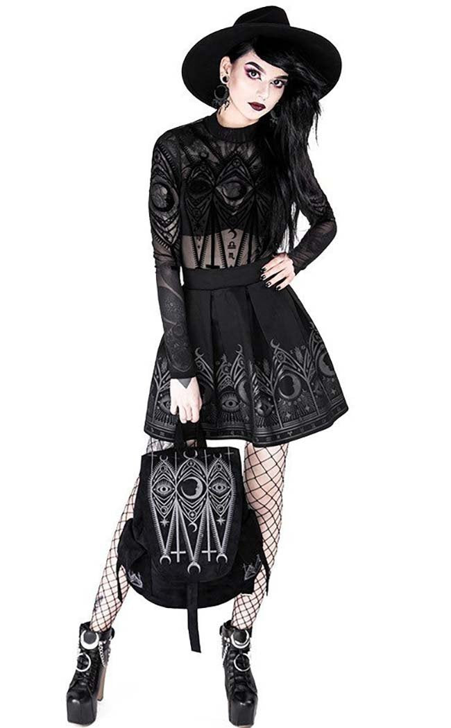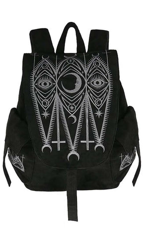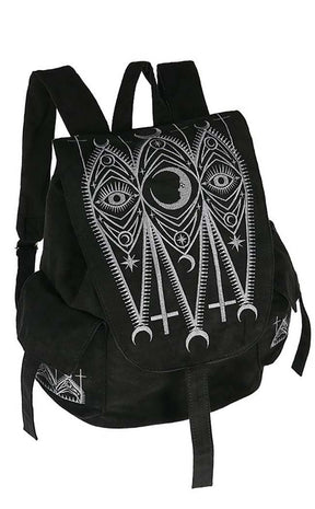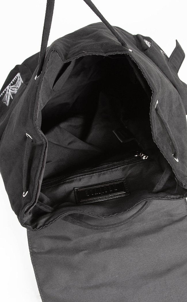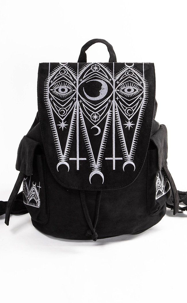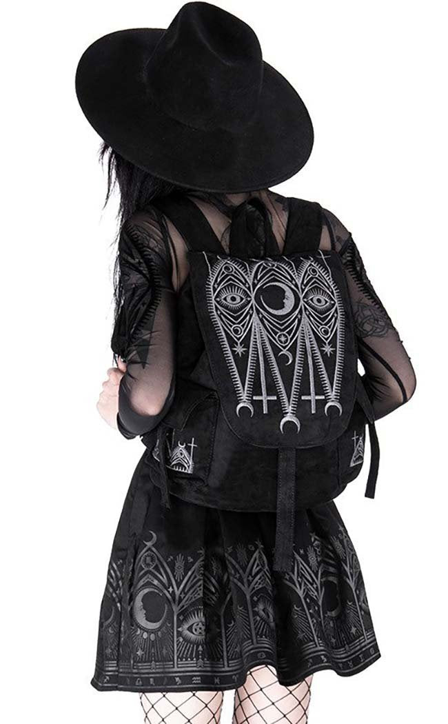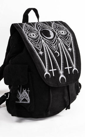 Secure your goodies in quality gothic architecture! This luxe, faux suede backpack features cathedral embroidery on the main flap and outer pockets, which secure with straps. The main compartment is deceptively roomy, opening bucket-style with a drawcord.