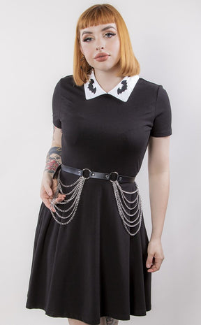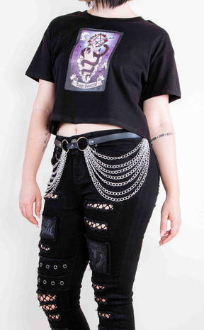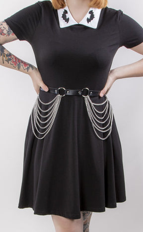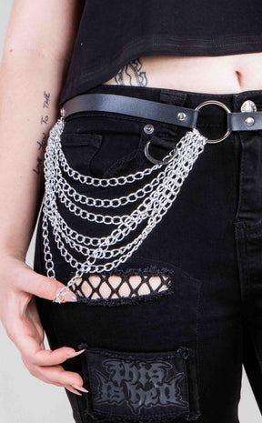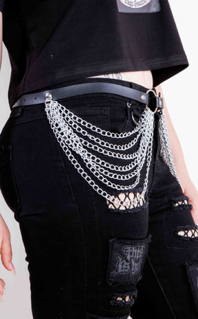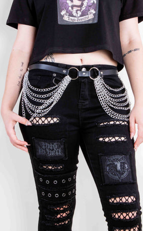 Drape your hips in chains and big metal energy. A vegan leather belt featuring two O rings at the centre, from which layers of metal chains drape over the thighs and connect at the hips.