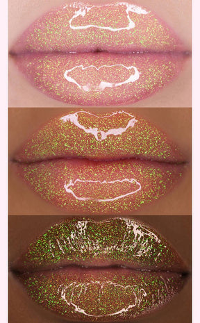 Nude with iridescent green shimmer wet-look lip gloss with a delicious cherry scent to give you a hint of colour and super shiny lips. This shade is sparkly and sheer.
