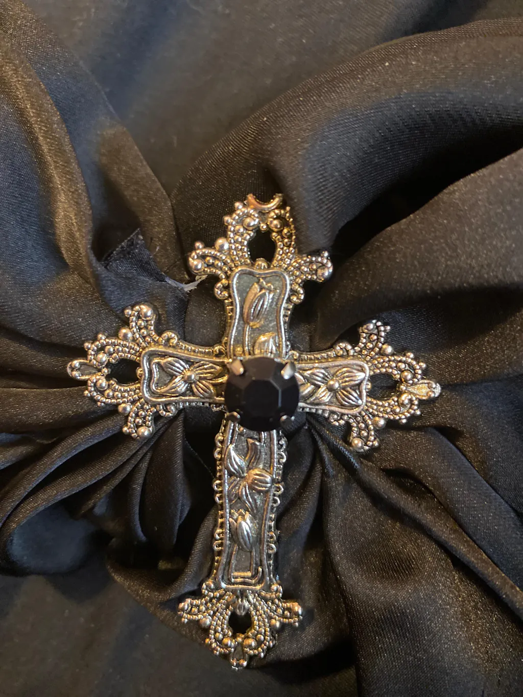 - Features: Detailed cross with faux black gem