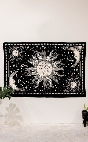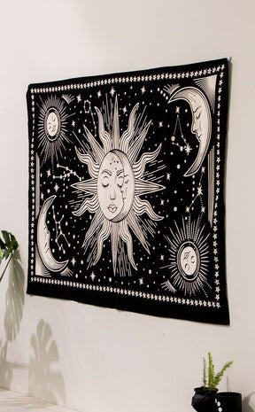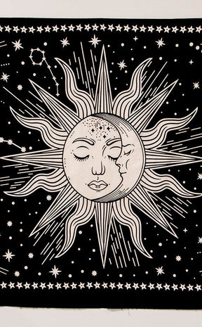Printed with a starry sky, sun and moon against a pitch black sky, this gorgeous cotton tapestry will add celestial ambience to any stargazer's home.