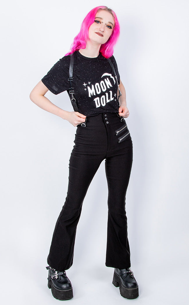 Assert yer dominance in the Corporate Misfit Pants! These high waisted pants come with statement suspender straps, faux leather details and decorative zips. The silhouette is fitted and wicked and the pants secure with 3 buttons and a zip fly.