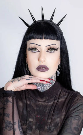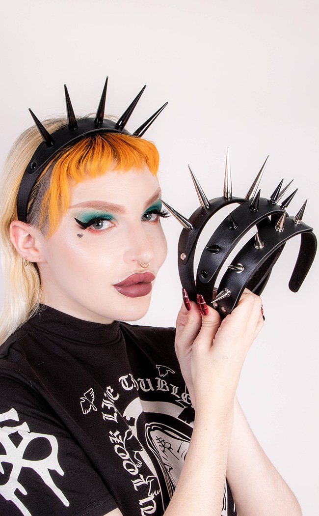 Make them bow down with this stunning hairband. Faux vegan leather is studded with long, sharp spikes of sleek black.