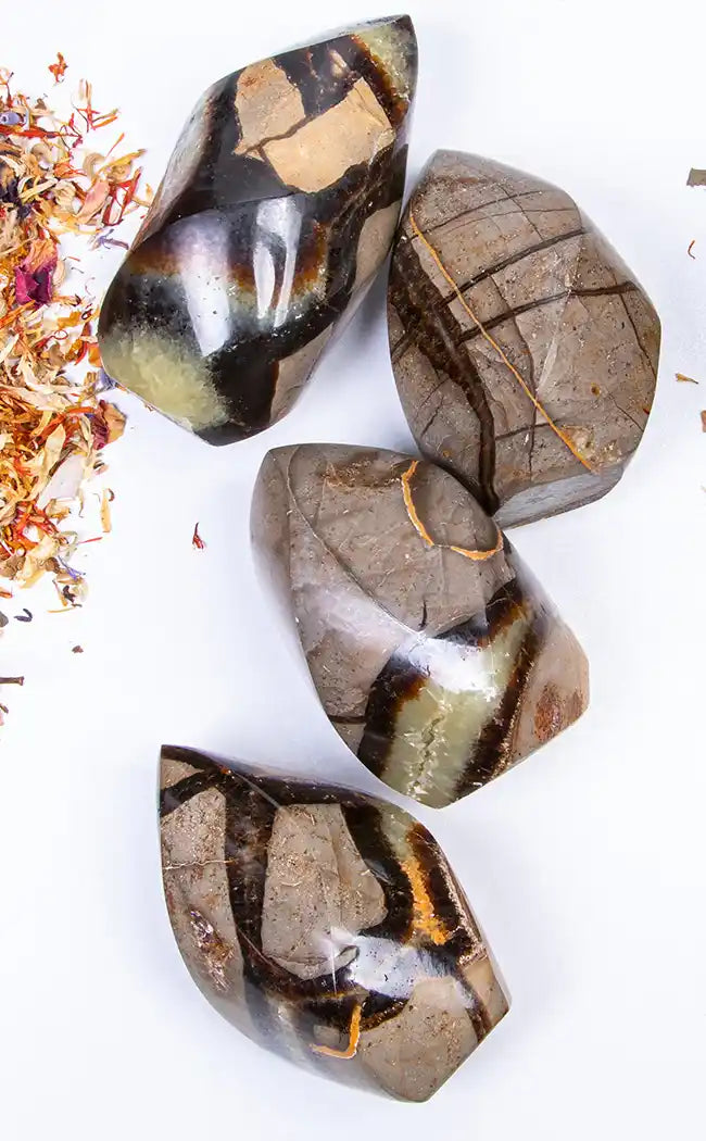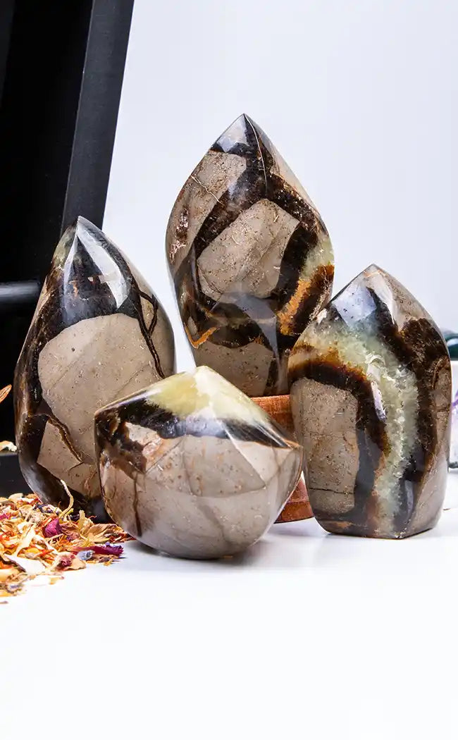Septarian is also called Dragon Stone or Dragon's Egg because many people have come to know of the egg shape with black druzy crystals inside as something that looks like a dragon's egg. A grounding stone, Septarian allows for better tolerance and patience, as well as emotional flexibility.