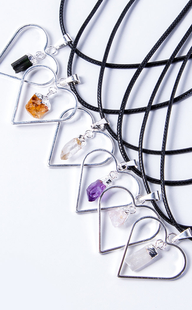 This cute necklace features a silver-look heart pendant holding a genuine rose quartz rough. Wear it as an amulet of protection or an easy way to accessorise with your favourite crystal!