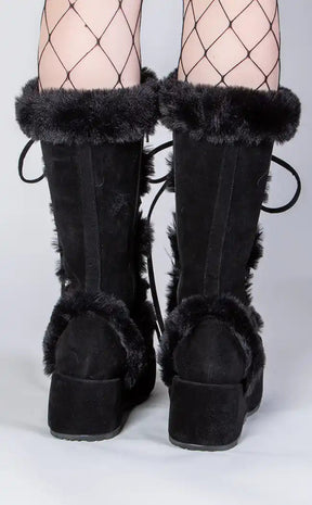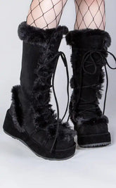 Kick winter hard in the CUBBY-311 boots! These mid-calf warmers are made with snuggly af faux suede and trimmed with faux fur. Securing with lace-ups and a full-length side zip, you'll be stomping through the chill in y2k style!