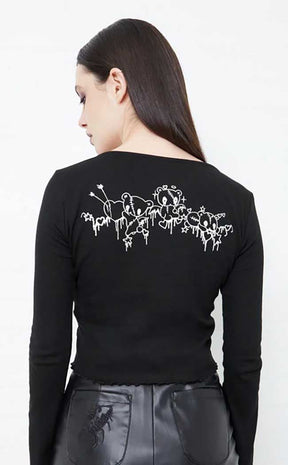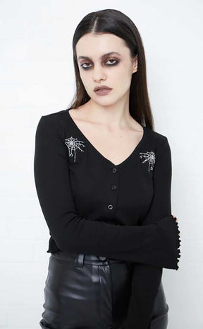 Create yer dream grunge looks with the Cynthia Cardigan! A lightweight cotton rib forms this cute cardi, featuring a deep v neck, a button-up front and lettuce-edge frill on the sleeves and hem that sits just below the natural waist. Two spiderweb motifs are embroidered on the front while the back features a cute zombie bear print.