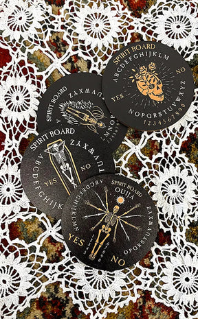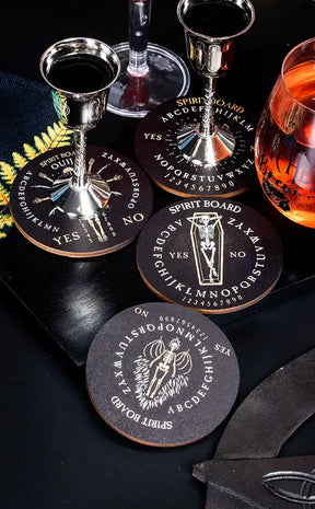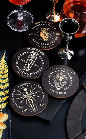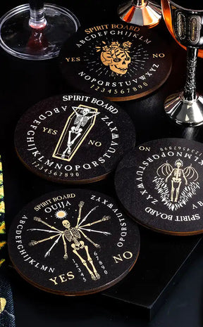 Your perfect séance accessory, for a drink strong enough to wake the dead! This creepy coaster set features artwork of spooky skeletons and ouija board prints. Each is different and all are ready to goth up your home!