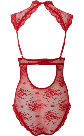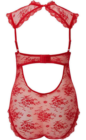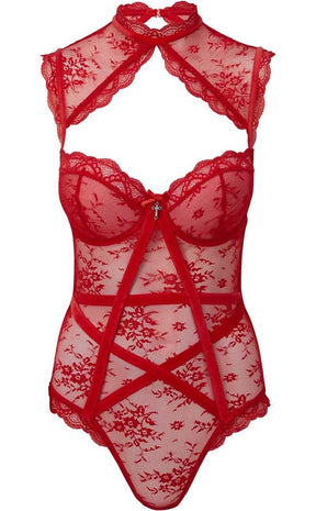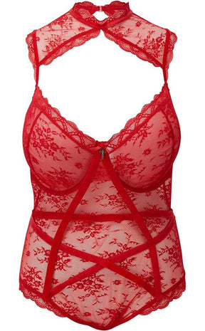 The Dark Desire Lace bodysuit will worship your curves and make jaws drop. Soft, luxury lace stretches across your bod with floral patterns, a pentagram stretching across the front. A statement lace yoke sets this apart from standard bodysuits, all trimmed with ruffles.