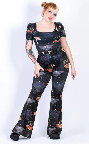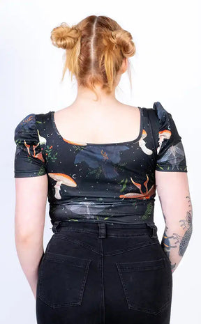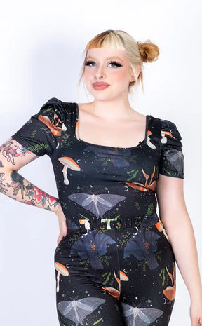 Enter a whimsical woodland realm in the Dark Divine Puff Sleeve Top! This top is made from super soft and super stretchy material and features cute puff sleeves. The print features fantastical lunar moths flying in the darkness surrounded by smaller moths, double headed crows and foilage as the mushrooms bloom by moonlight. Works perfectly with the matching flares, or wear it with your fave jeans or shorts for a fun look.