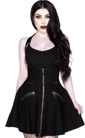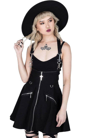 Add a piece of versatility to your wardrobe that's as black as your soul: this skirt is high waisted with statement suspender straps that come trimmed with inverted crosses. The front fastens with a matching cross zip and flares out generously.