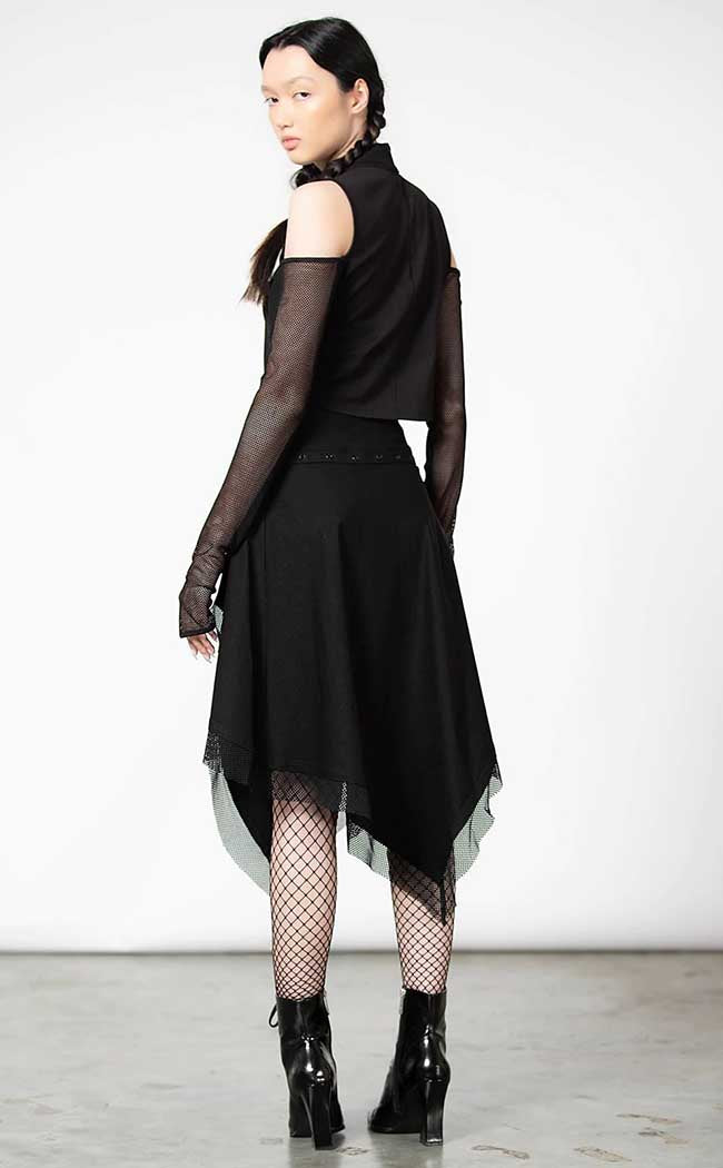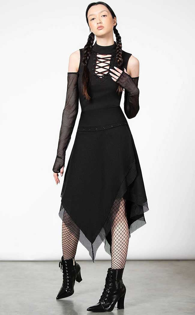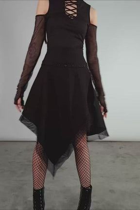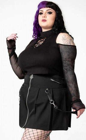 Change it up with the Dark Half Long Sleeve Top! Soft, stretch fabric hugs ger bod, forming a high neckline with a lace-up keyhole detail. Long mesh sleeves come with thumbholes to cover your hands, creating a wicked mix of Tradgoth and modern lewks.