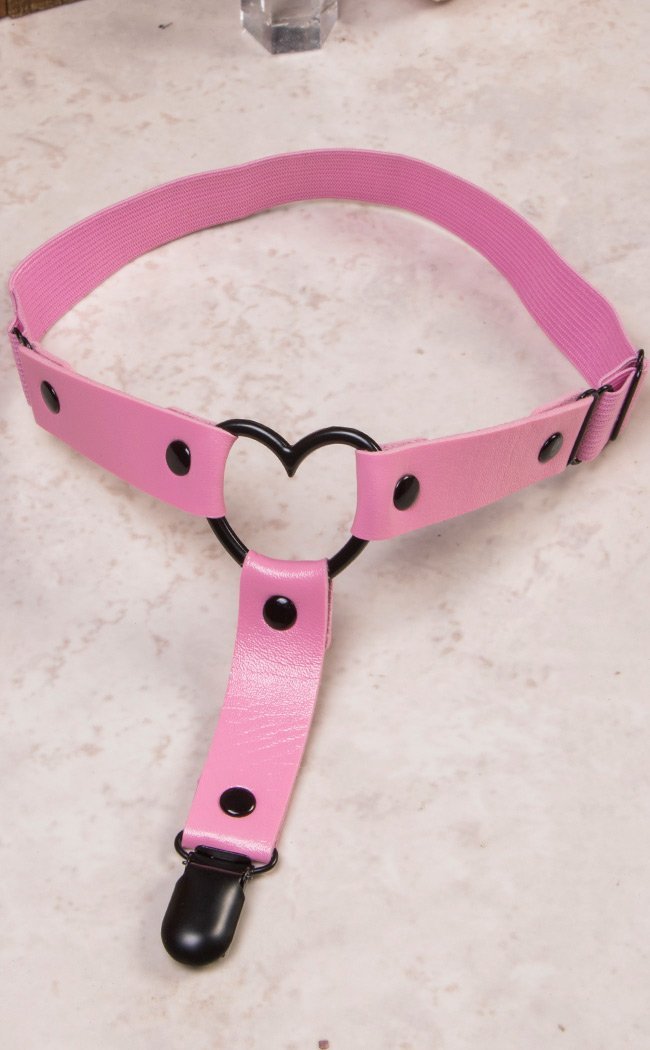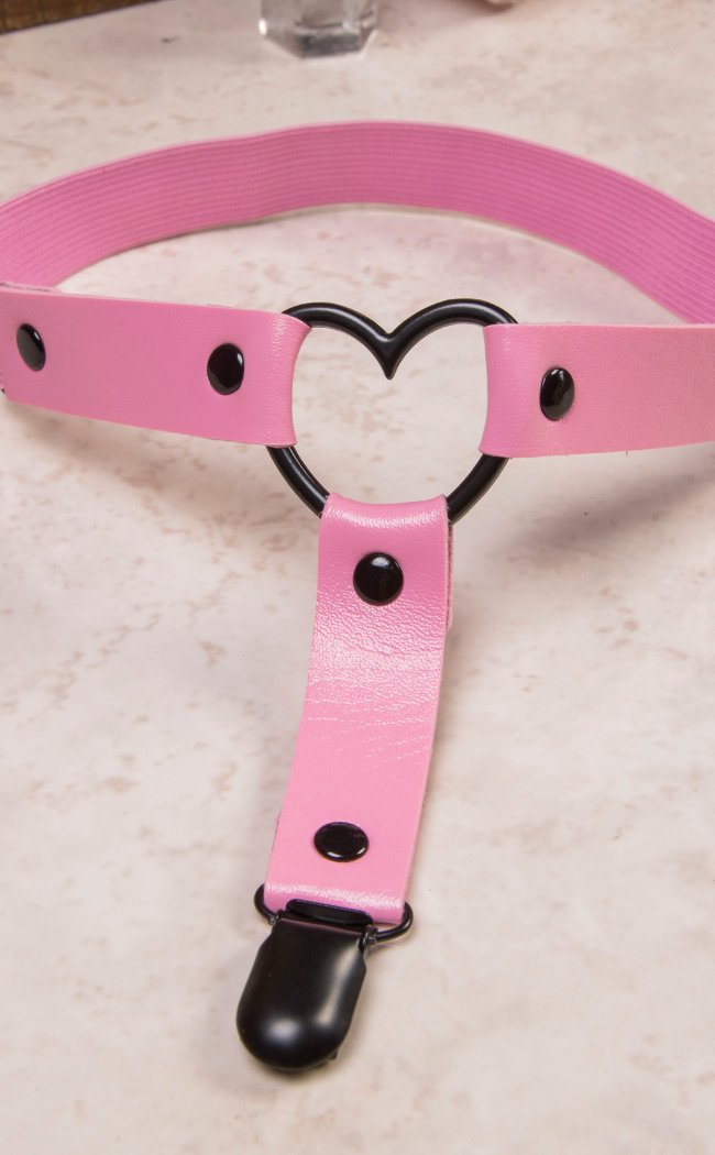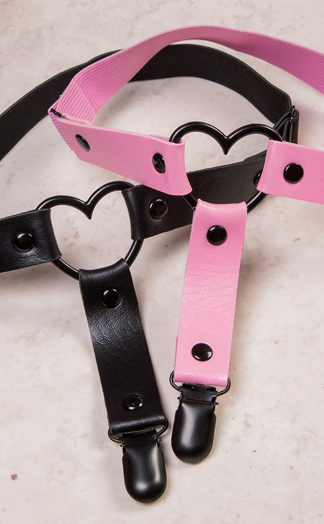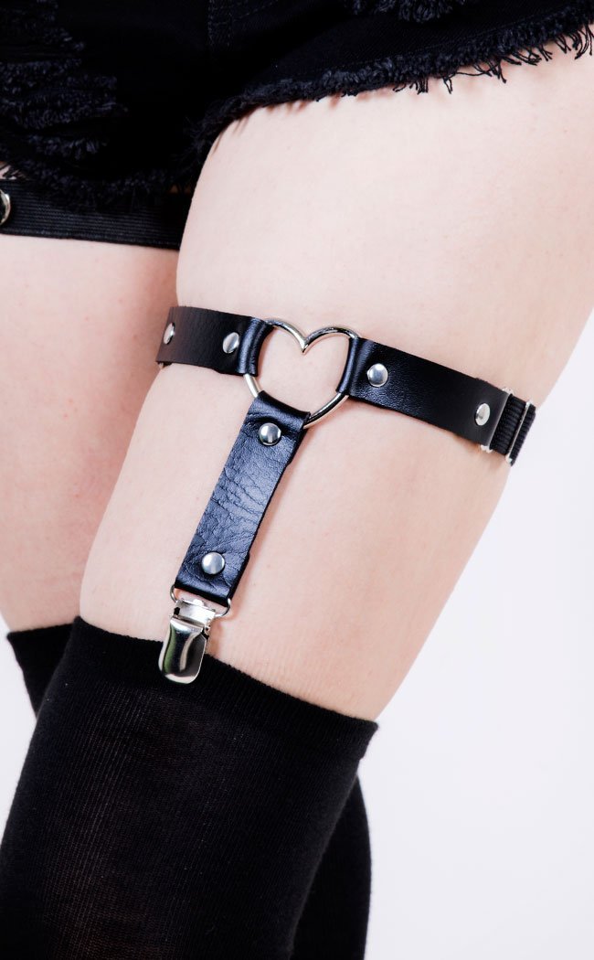 Gothic lolita garter with black coloured metal heart and elasticated back. These garters have a clip at the front to attach to stockings or socks, and are adjustable so can fit a variety of sizes.