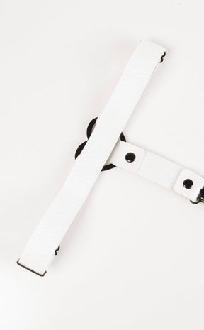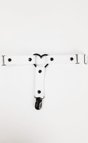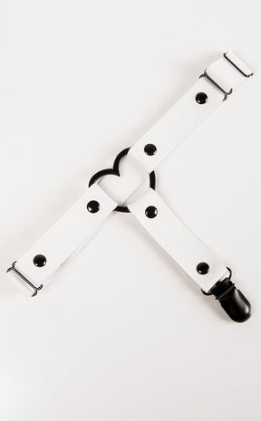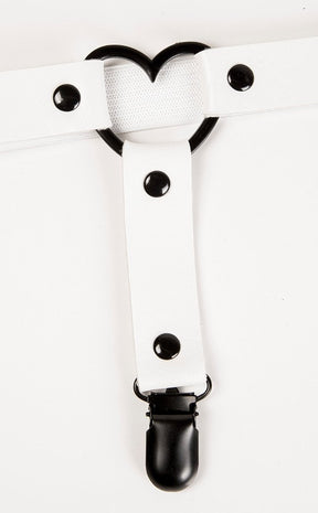 This sweet garter brings Lolita vibes with a black metal heart and white vegan leather. The suspender straps come with clips to attach to stockings and stock and the rear is elastic, adjustable for legs of all sizes.