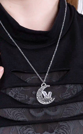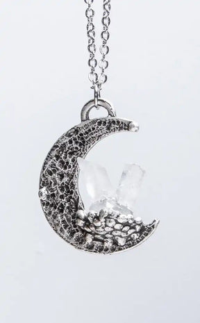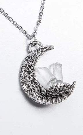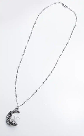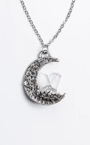 This necklace evokes the magic of the moon with a battered siler crescent moon with 2 genuine quartz crystal shards in the centre.