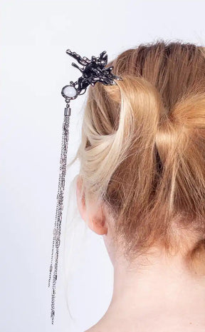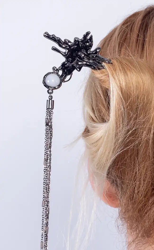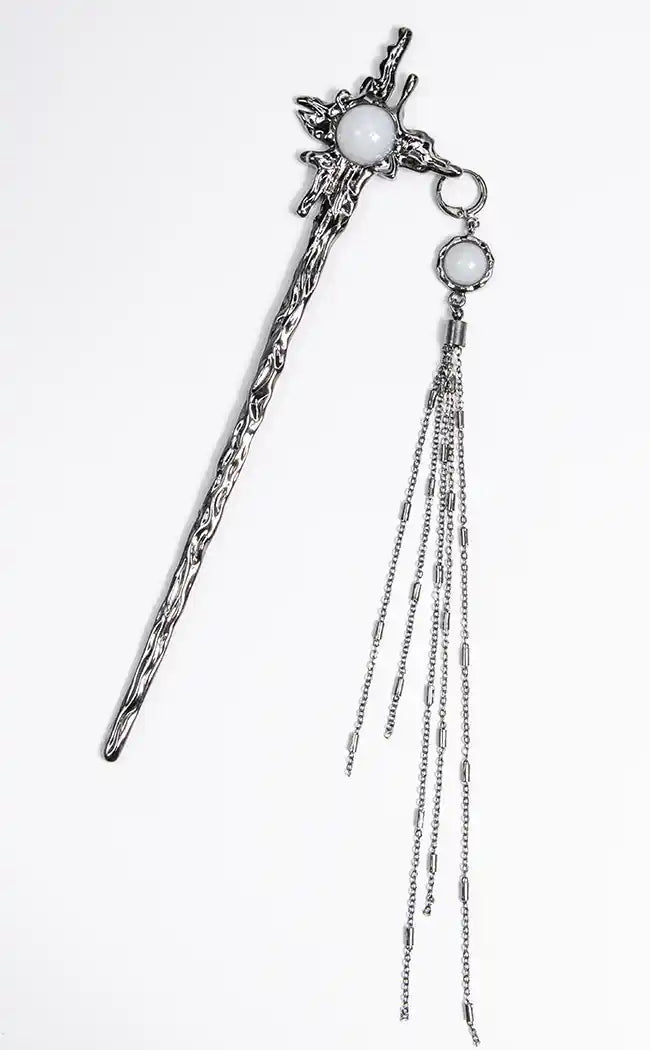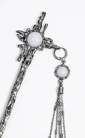 This hair stick features a twisted metal design with a white gem at centre, and delicate strands of antique silver chains loose to flow around you as you walk! Stick is made from sturdy alloy metal and long enough to cause damage.