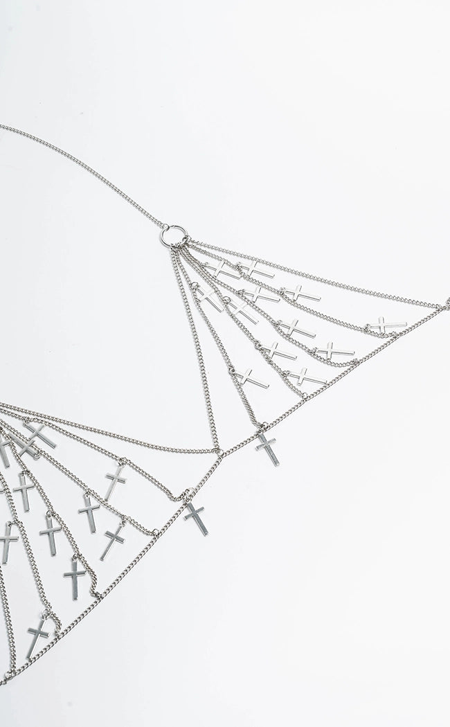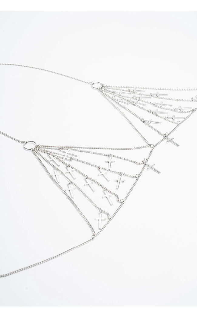 Resurrect yer wardrobe with the Dead and Buried Chain Harness! Thin chains form a strap that goes around your neck and back, and two curtains of chains with crosses hang across the chest.