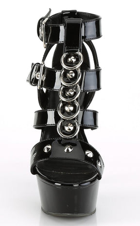 Ultra strappy black patent heeled sandals with buckled T-Straps featuring metal rings and studded details.