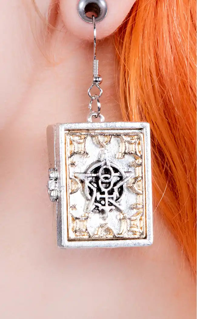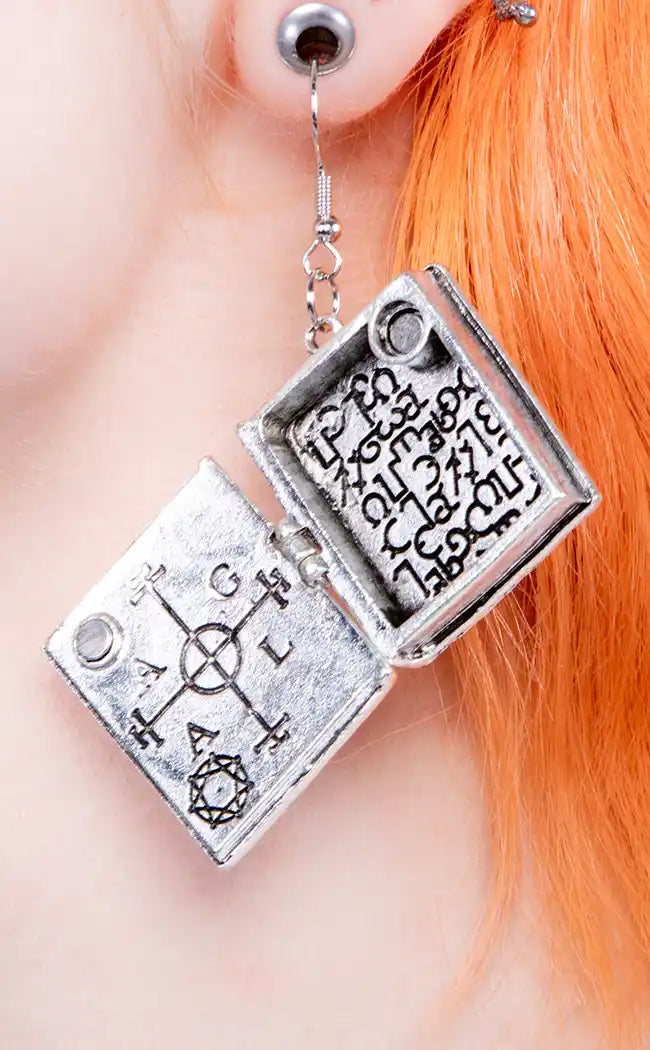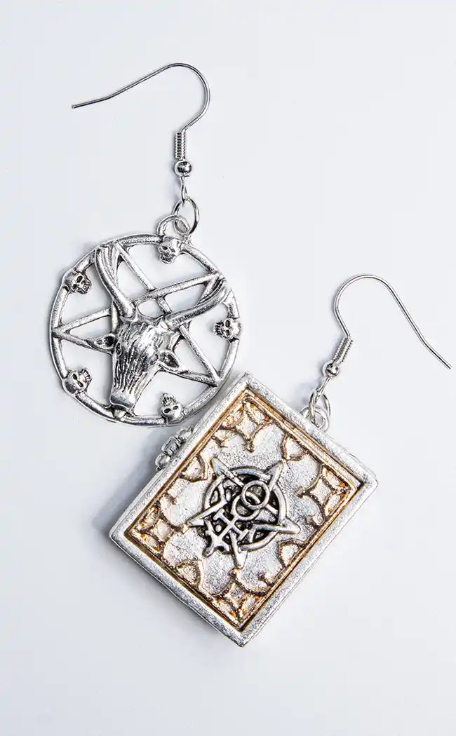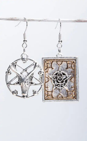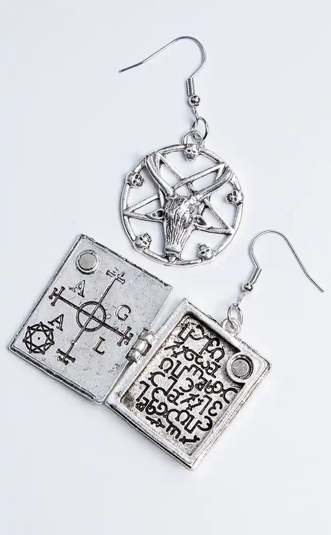 These cool earrings feature a Baphomet symbol in a pentagram on one ear, and the other features a book with occult symbols which actually opens. You can even keep tiny things inside.