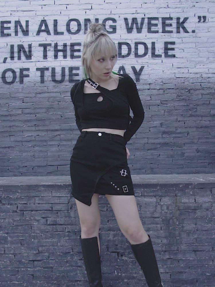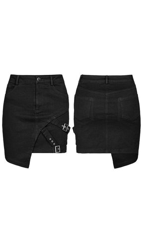 Hug yer body in this tight denim number! This skirt sits high on the waist and ends in an asymmetrical layered-look hem. Two buckles add an extra pink flair to the whole affair.