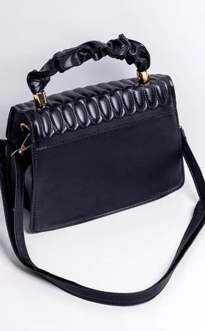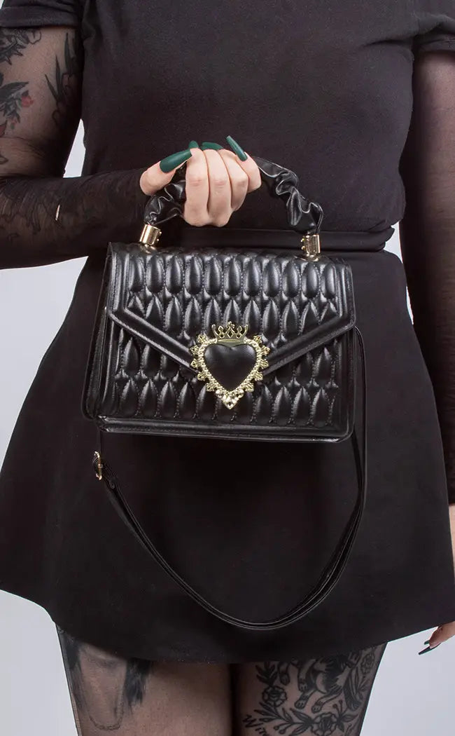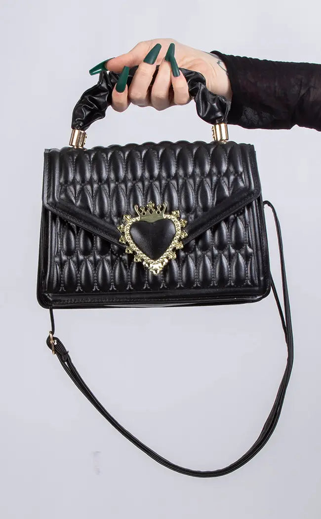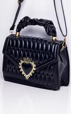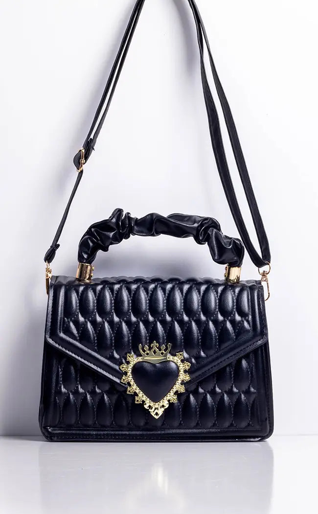 Treat yourself like the goddess you are with this beautiful black quilted handbag replete with crowned heart metal charm.