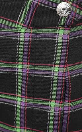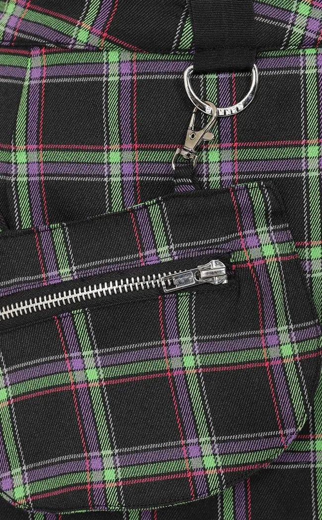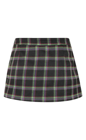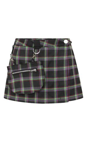 The perfect mix of cute and edgy, this wrap-around skirt is designed in a classic green and purple tartan pattern and features a detachable pocket.