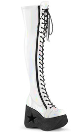 Baby, you're a star! The DYNAMITE-318 boots are wicked thigh-highs made with stretch faux leather that tops a glittering wedge, securing with a full zip & lace-ups.