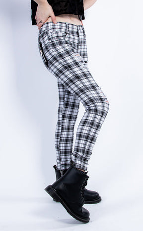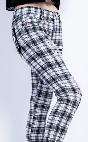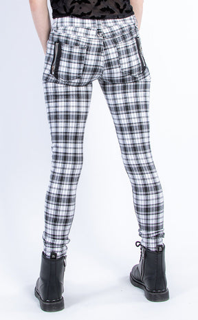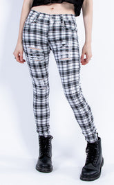 Badass white tartan jeans with front pockets, back zipped pockets and O-ring details. Nicely ripped. Pair with some bad ass black boots and chain belt. Stretchy, comfy material.