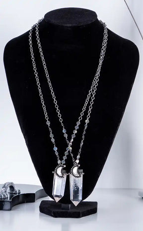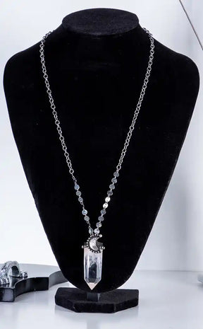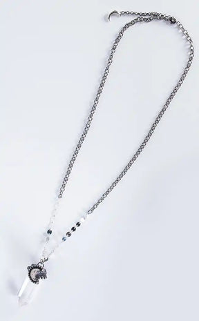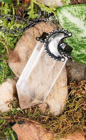 The Eclipse Clear Quartz Crystal Necklace is made from a beautiful clear quartz crystal that has been cut into a point and polished. It is then encased in a handmade sculptured solder setting, with a crescent moon in front. It hangs from a gunmetal plated chain with silver discs on each side to reflect the light and is adjustable between approximately 71-78cm long. It has a lobster clasp and a crescent moon charm. These necklaces are hand made and each is beautifully unique.