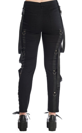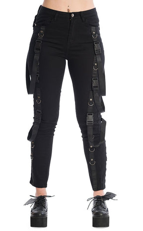 Bondage jeans with a twist! The Edana Trousers are high waisted skinny jeans that feature bondage straps with plastic buckles along the seams. The fabric stretches comfortably to flatter yer bod so you can kick it casually every day.