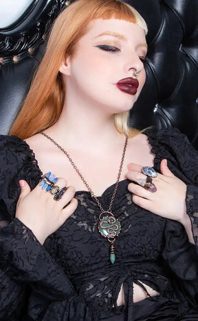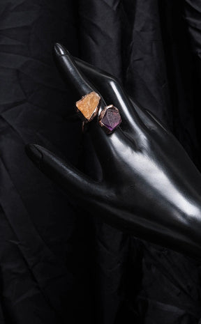 The Emanations Amethyst & Citrine Ring is made from hand carved genuine raw amethyst and citrine crystals. Hand soldered and finished in bronze coating, these rings are fully adjustable.