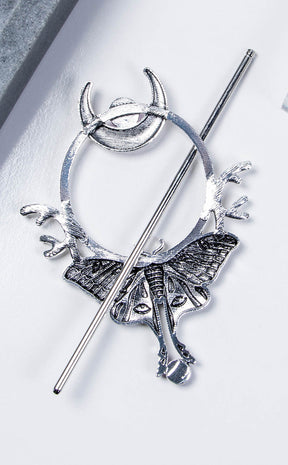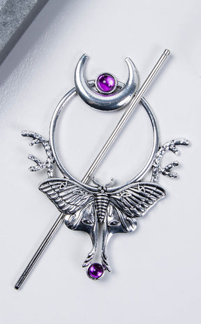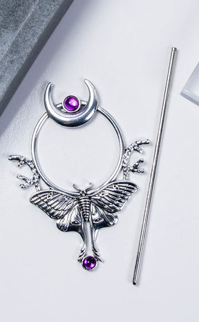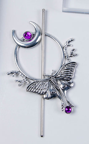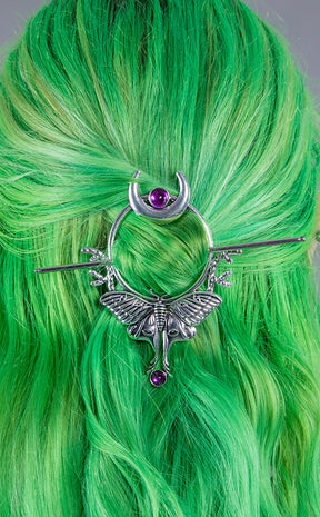 Add a stunning crown to your hairdo with the Enchanted Forest Hait Pin! The barette features a ring crowned with a crescent moon and features a lunar moth at the bottom along with antlers and two shining purple gems.