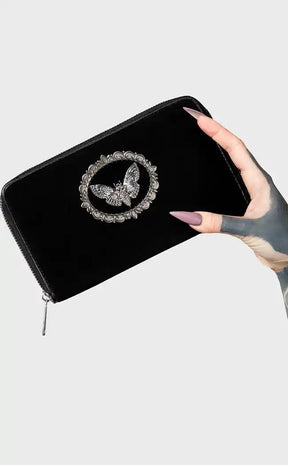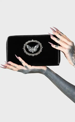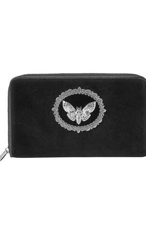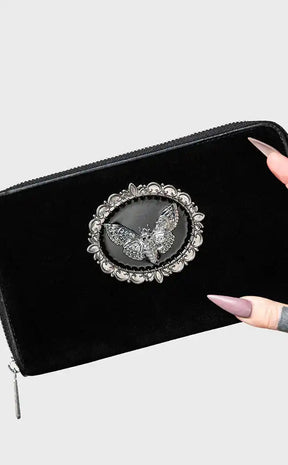 Add a little deadly glamour to your look. This wicked purse is made from soft luxe velvet, with a deaths head moth cameo finished in darkened silver.