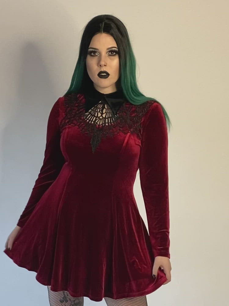 This dress is made of incredibly soft velvet with a high, collared neck and long sleeves. The yoke is an intricate applique reminiscent of tangled vines in an abandoned garden. Fitted at the waist with a corset backing, the skirt ends above the knees in a modern take on Victorian imagery.