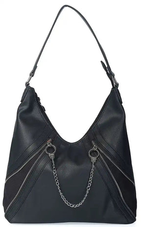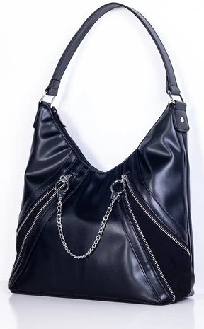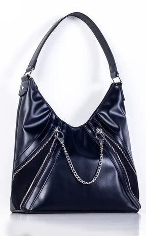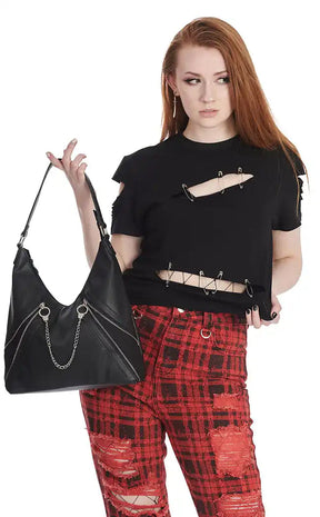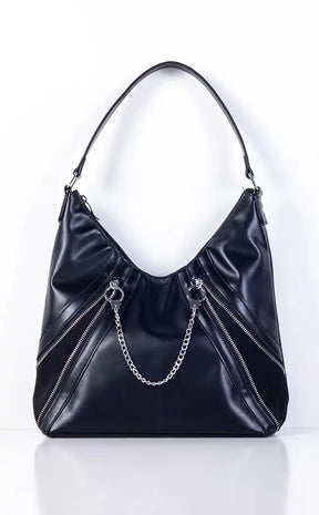 Add a pinch of bondage to your outfit with the Entwined Hobo Bag. A great way to add some edge. Basic black - of course! and accented with badass deets like open zip details and a metal chain with handcuffs. The bag secures with a zip and comes with plenty of room for all of your gothic goodies.
