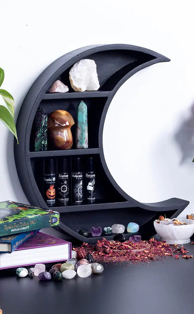 Bring a little bit of the night sky into your home with this crescent moon shelf! This black, wooden crescent shelf is perfect for organizing your small trinkets and collectibles. With this shelf, you're sure to be over the moon with your decor!