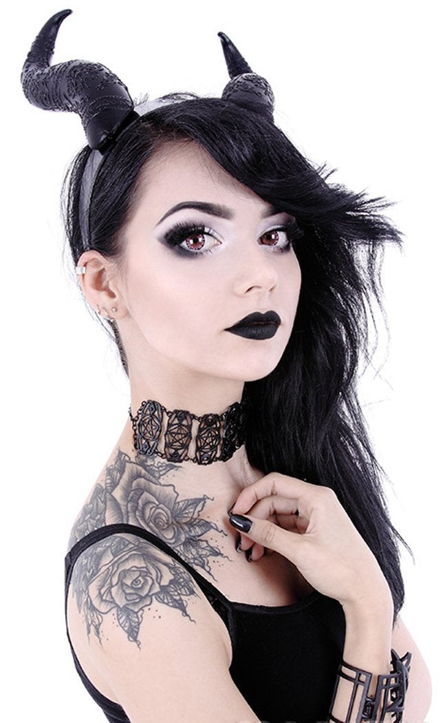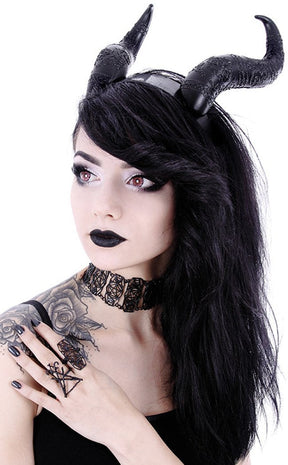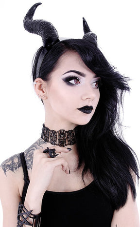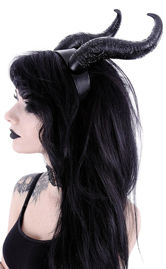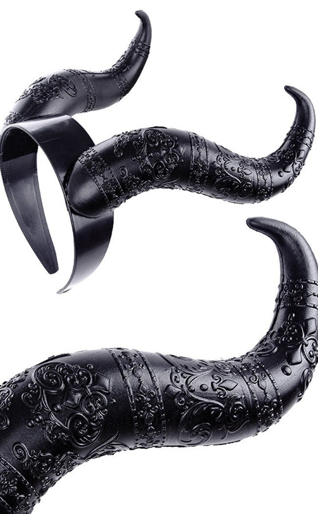 Wide headband adorned with black horns with and intricate and unique pattern. Horns are made of very durable material, and very firmly attached to the headband. This stunning headband is super light and comfortable to wear.