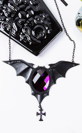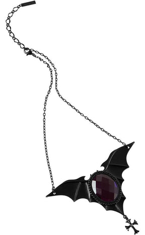 Get yer night creature on with the Evil Intentions Necklace! A large batwing pendant spreads across the collarbones, featuring a wine gem inset and a dangling cross charm.