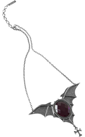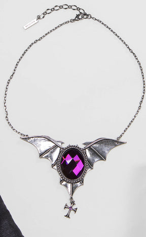 Get yer night creature on with the Evil Intentions Necklace! A large batwing pendant spreads across the collarbones, featuring a wine gem inset and a dangling cross charm.