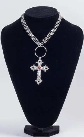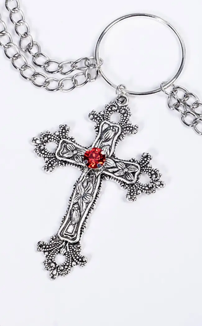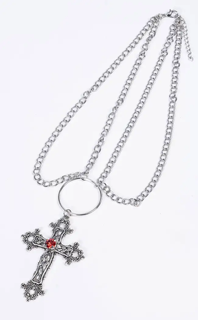 The Evil Objectives Necklace will be the ultimate addition to any outfit! This necklace features a double chain attached to a ring and a detailed cross pendant with a bright red gem in the middle. This necklace will have your evil objectives accomplished in no time!